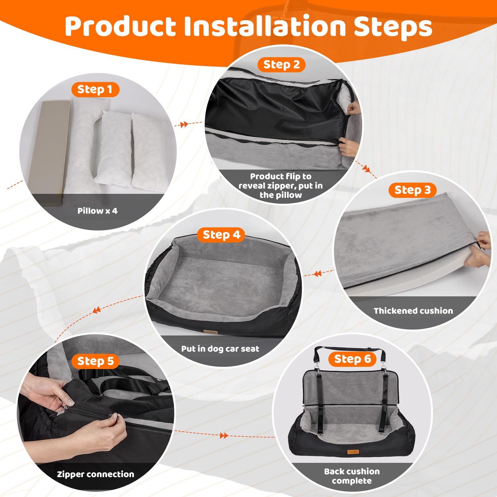 - EASY INSTALLATION - TWICEMET Dog Car Seat To minimize damage during shipping, we pack the insert and cover separately. The installation process is very simple, refer to the instructions and videos we provide. Flip the cover over to find the zipper, pull it open and put in 3 pillows and put 1 back cushion on the side near the back; then put the padded cushion into the cushion cover and the installation is complete.